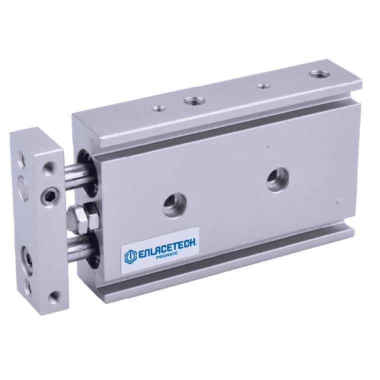 Este cilindro neumático guiado se destaca por su diseño compacto en ancho y largo, incorporando una guía de precisión que permite la aplicación de altas cargas laterales. El cilindro cuenta con amortiguadores elásticos calibrados y un cuerpo de aluminio, lo que asegura una estructura ligera pero resistente. El pistón también está fabricado en aluminio, mientras que el vástago de émbolo es de acero cromado C45, garantizando durabilidad y resistencia al desgaste.